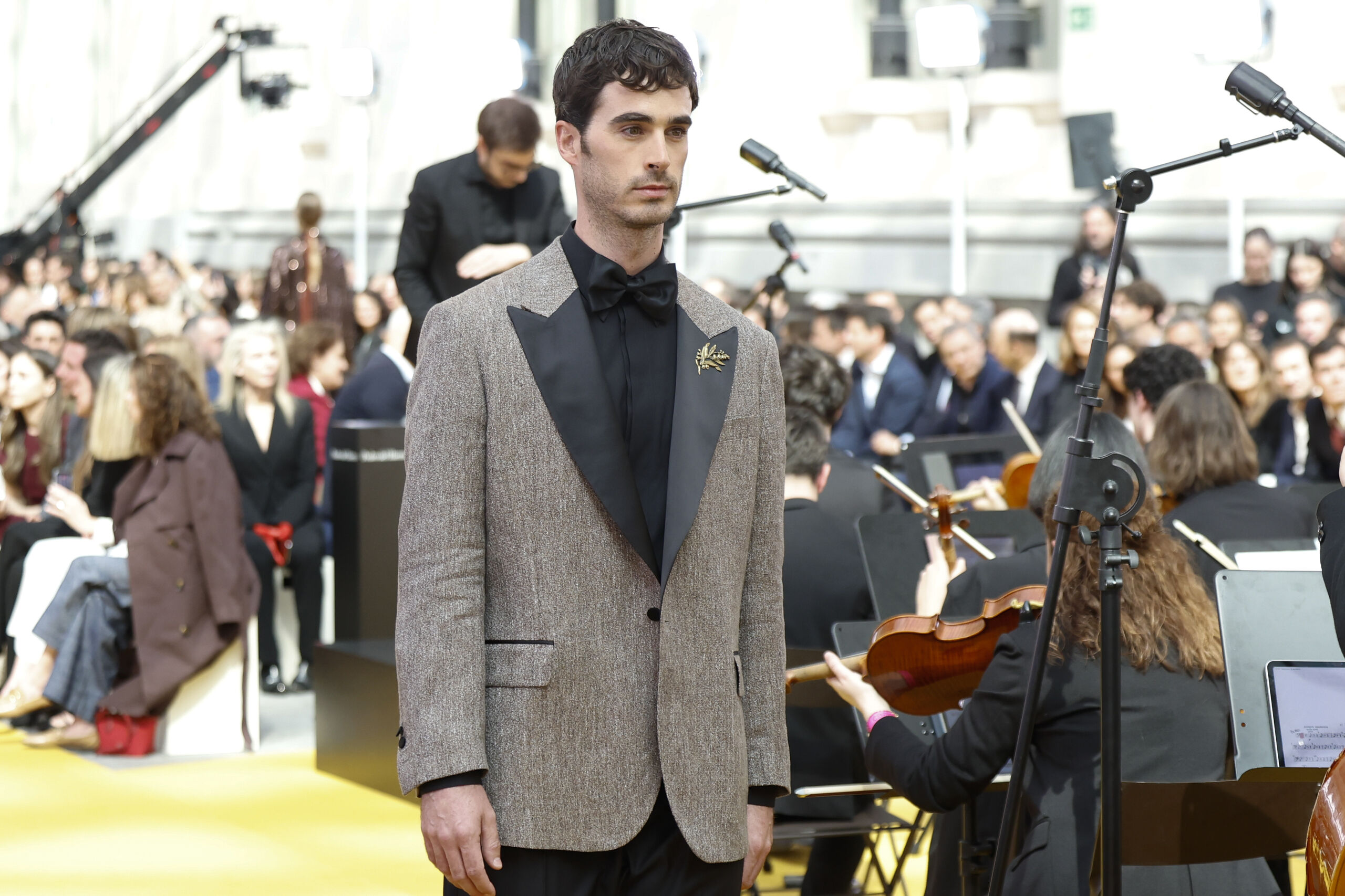 Una colección presentada en un entorno bucólico, donde los modelos como Almudena Cañedo, novia del cantante Leiva, o Luis Zamalloa, marido de Marta Pombo, han desfilado sobre una alfombra mostaza mientras sonaba la música en directo de una orquesta que ha interpretado varias piezas del ballet El Cascanueces de Tchaikovski.