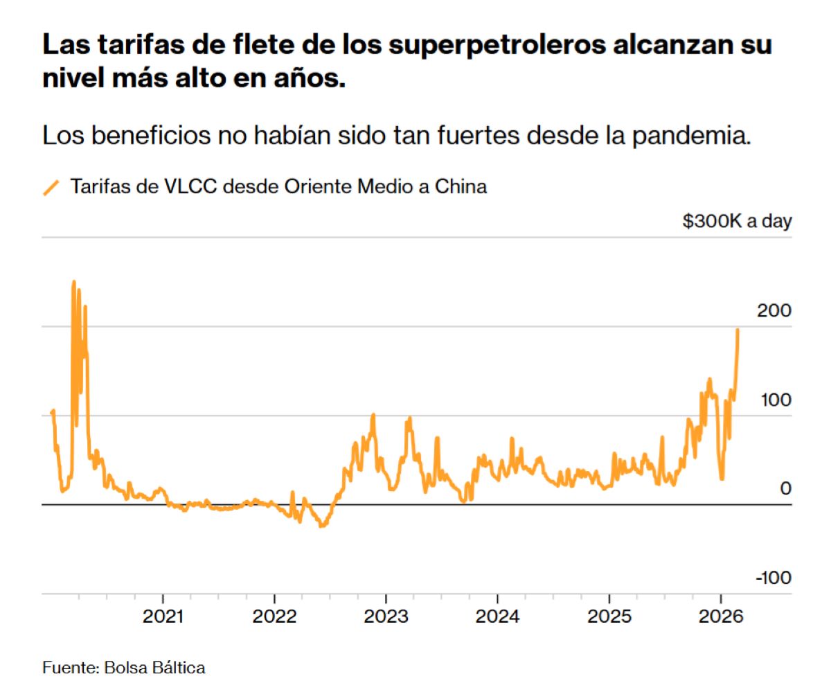 Asimismo, Bloomberg también explica que, según datos de la Bolsa Báltica de Londres, el coste de transportar dos millones de barriles de petróleo desde Oriente Medio hasta China alcanzó el martes casi 200.000 dólares diarios, el nivel más alto desde 2020. Concretamente, uno de los buques contratados por Bahri, el DHT Jaguar, fue fletado por un equivalente a 208.000 dólares al día, de acuerdo con datos de Tankers International.