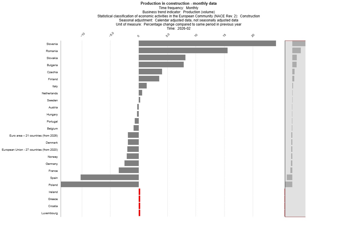 Según Eurostat, la producción del sector de la construcción en España registró en febrero una caída interanual del 10,2%, situándose como la segunda mayor bajada entre los países de la Unión Europea, solo por detrás de Polonia, según los datos difundidos por Eurostat. Así, el descenso en España contrasta con la evolución media del conjunto de la Unión Europea, donde la producción se redujo un 2,0% interanual, mientras que en la eurozona la caída fue del 1,9%.